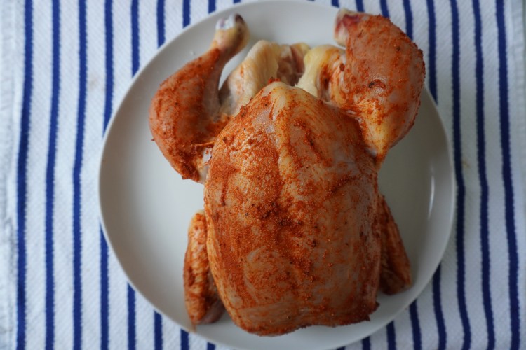 1-2 days before you want to roast the chicken: pat the chicken dry and rub kosher salt all over the skin and in the cavity (amount of salt depends on the size of your bird – see above for guidance)