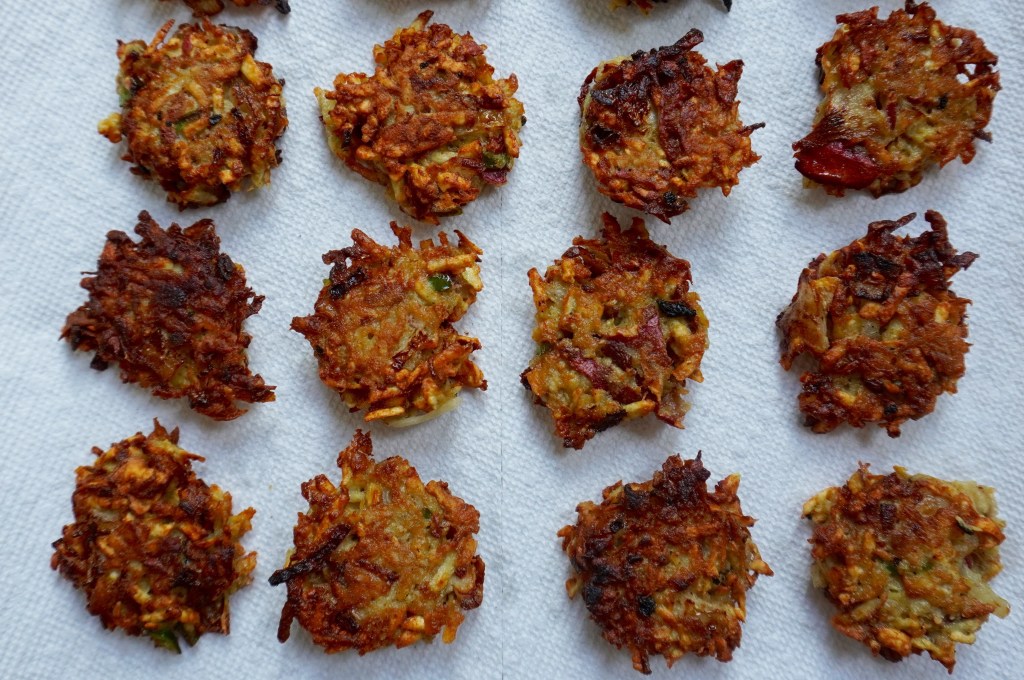Once you have a layer of latkes on the paper towels, transfer those latkes to the second cookie sheet and put into the oven to keep warm. Replace the oily paper towels with a fresh set, and continue to make latkes – letting them drain on the paper towel-lined cookie sheet and then transfer to the oven to keep warm.