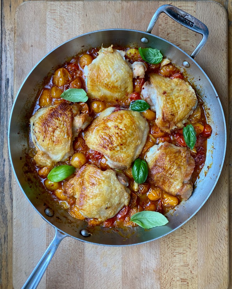 The origin of this simple, 45-minute, and 1-skillet recipe is a braised chicken dish made with canned, crushed tomatoes. With an abundance of cherry tomatoes in my larder, I tried the same recipe using fresh tomatoes instead of canned. Folks, we have a winner!