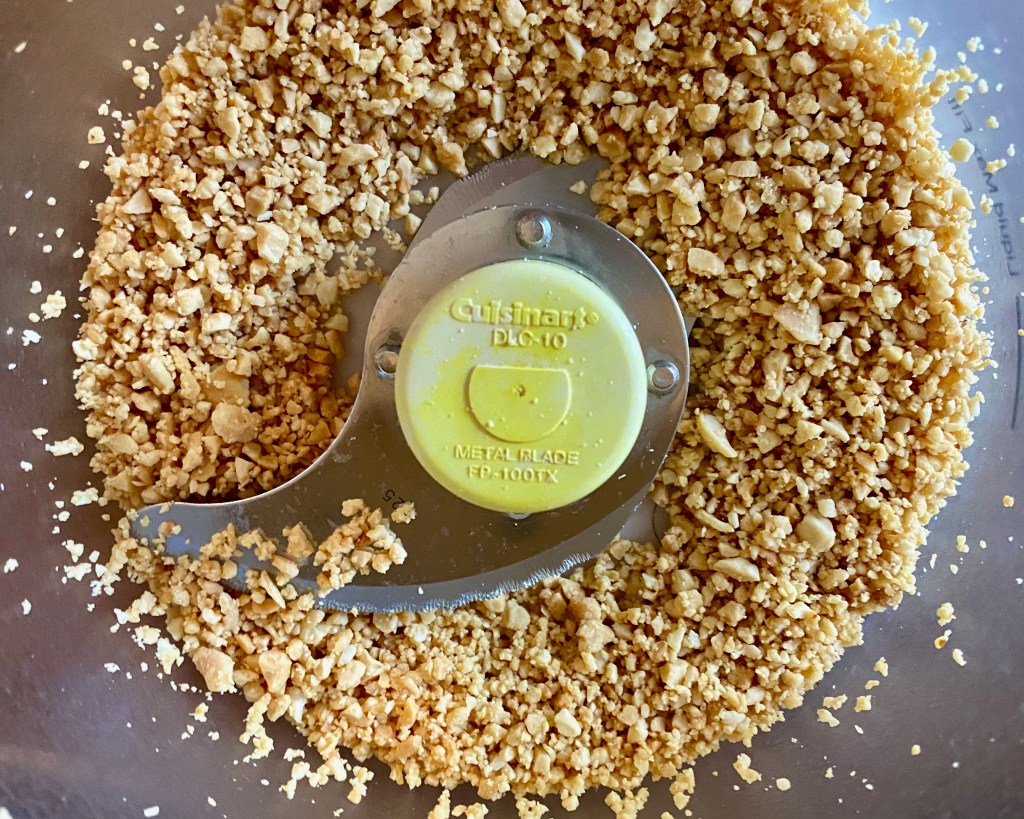 Add the peanuts to a food processor, and pulse to pulverize. You want very small pieces, but not so small it’s the texture of sand. Or, if you really go too far, you will end up with peanut butter.