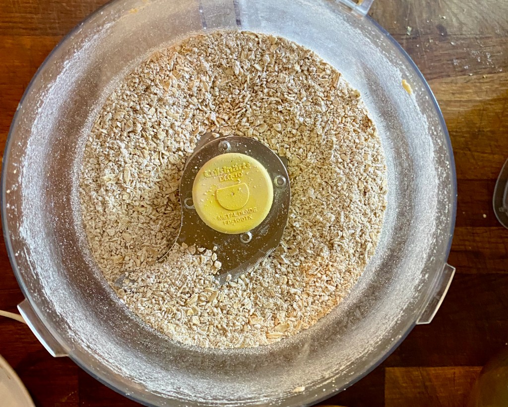 Add processed peanuts to a large bowl. Then add 1 cup of the oats to the food processor and the other 1 cup of oats to the large bowl with the peanuts. Pulse the oats to process into small pieces, but don’t take it to the texture of oat flour. Transfer to the large bowl.