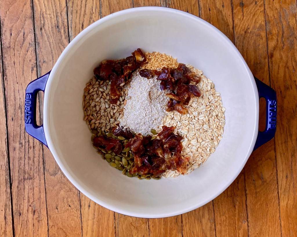 Add the seeds to the bowl. Chop the dates and add them as well.