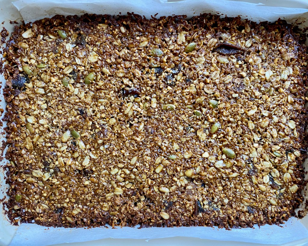 Granola bars are one of my (many) comfort foods. I remember eating quaker oats chocolate chip granola bars after school as a kid. These are a hybrid of a cookie and a granola bar. They feel somewhat virtuous due to a combination of oats, nuts and/or seeds, and some dried fruit.