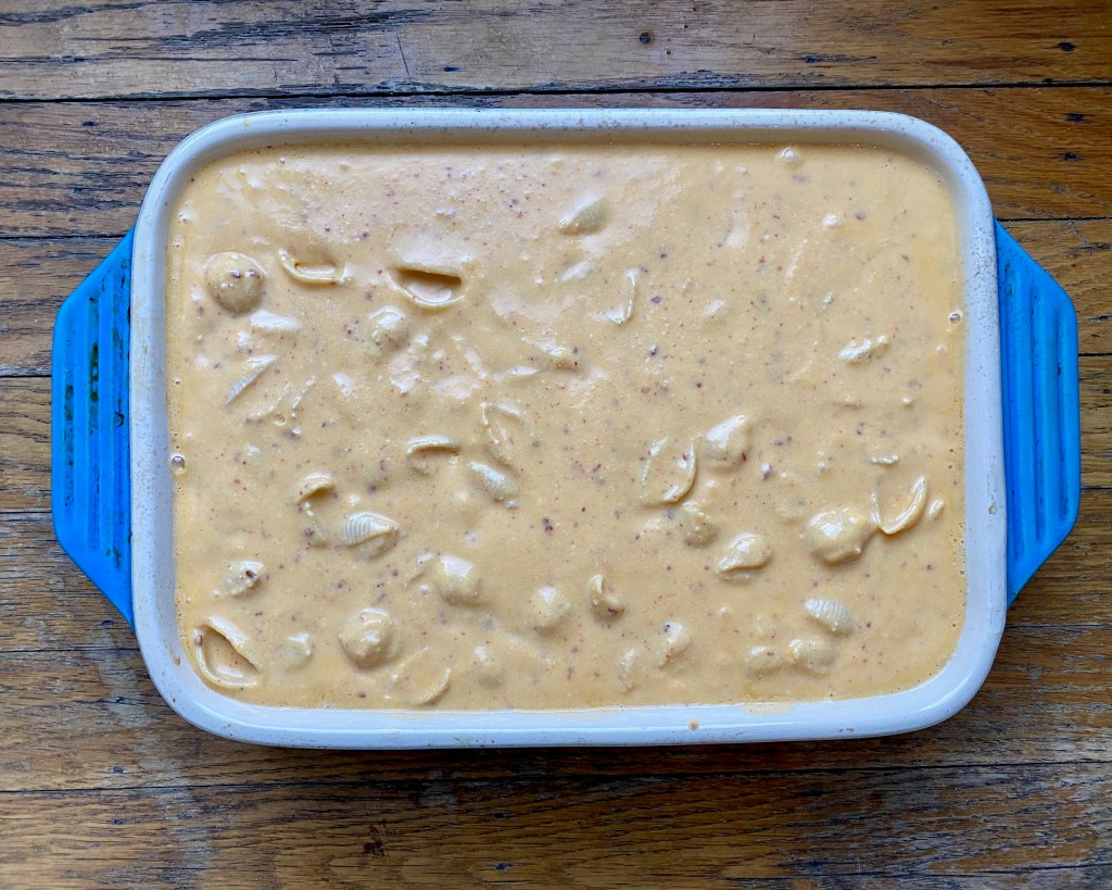 Add the sauce to the bowl with the pasta. Mix thoroughly. Pour everything into the baking dish.