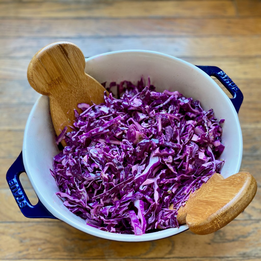 Pour the dressing with red onion on top. Mix well and taste – add salt if needed.