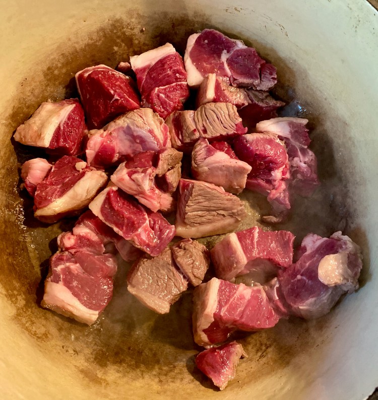Preheat the oven to 350 F. Heat Dutch oven on the stove over medium heat, and when the pan is hot add olive oil. In two batches, brown the lamb pieces, about 10 minutes per batch. When the lamb is brown, remove from Dutch oven onto a large plate.