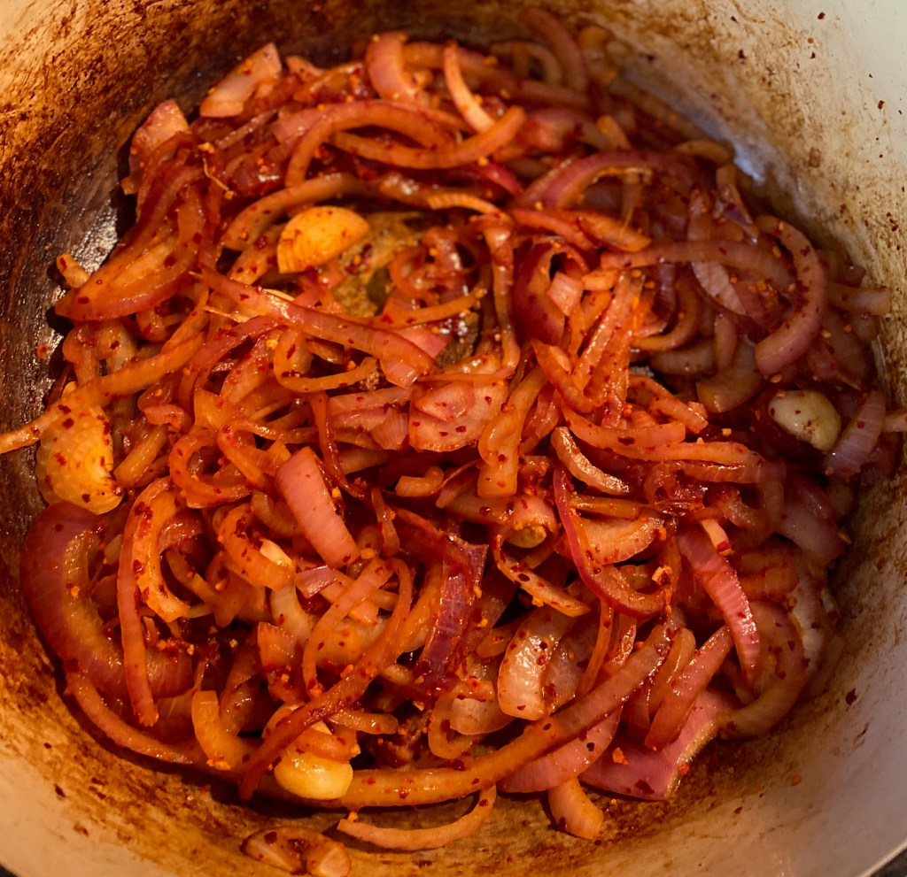 Add the red onion and garlic to the Dutch oven and saute for five minutes until vegetables start to get some color. Add harissa and saute for another two minutes. Add stock and water to the vegetables and bring to a simmer. Return the lamb to the pot, cover and bake for 1 hour.