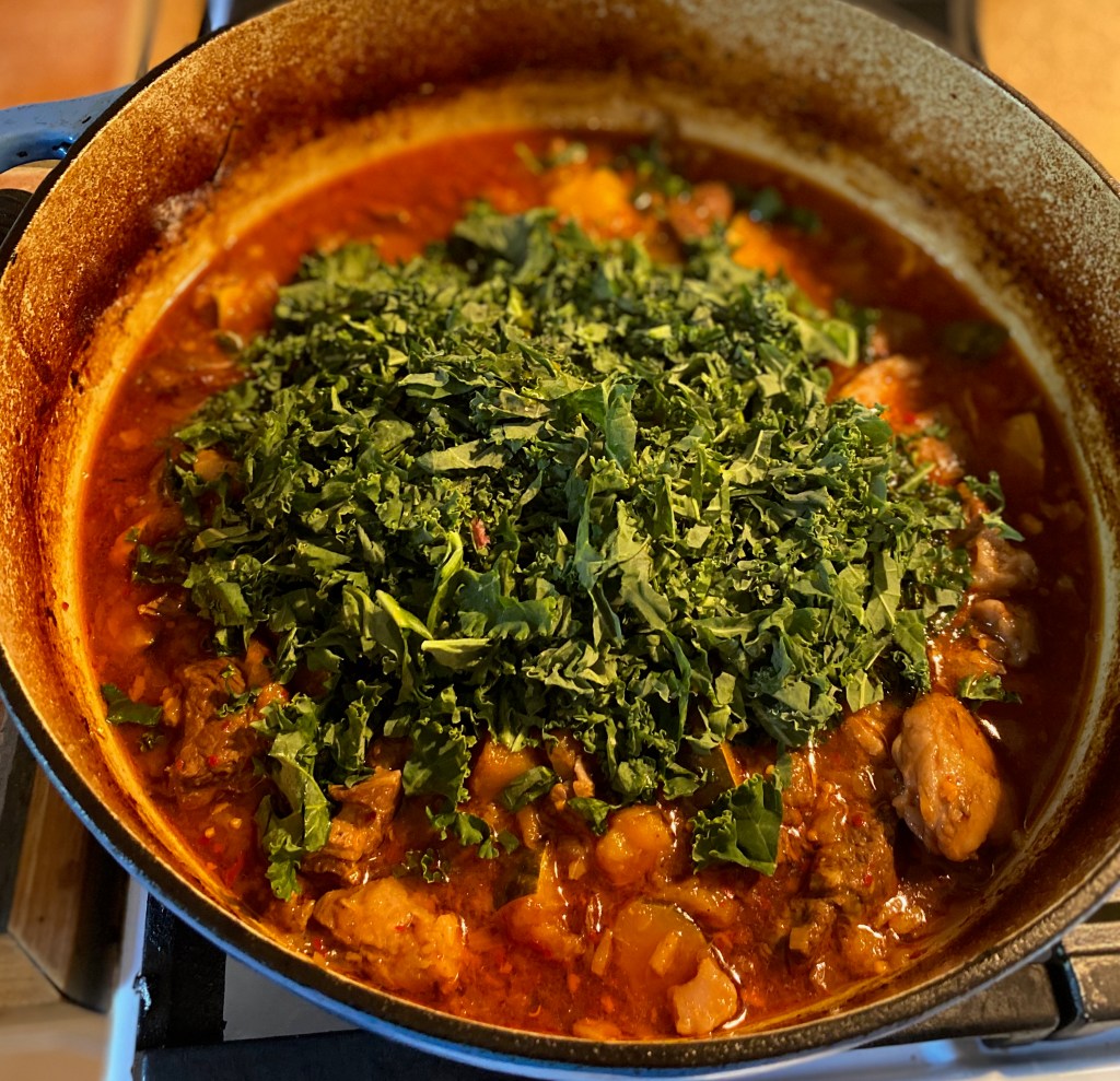 Put the stew back in the oven, uncovered, and cook for 20-30 minutes more. The sauce will reduce and the kale will be wilted.