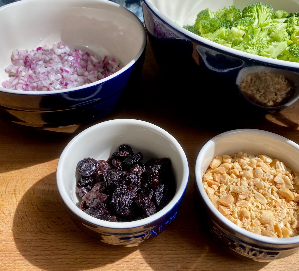 I made this recipe on a whim a few years back, and it has steadily stayed in our regular rotation of salads that go well with a piece of roast chicken, a burger, or some sausages. The combination of crunchy broccoli, tangy dressing, sweet raisins, and salty peanuts is irresistible.