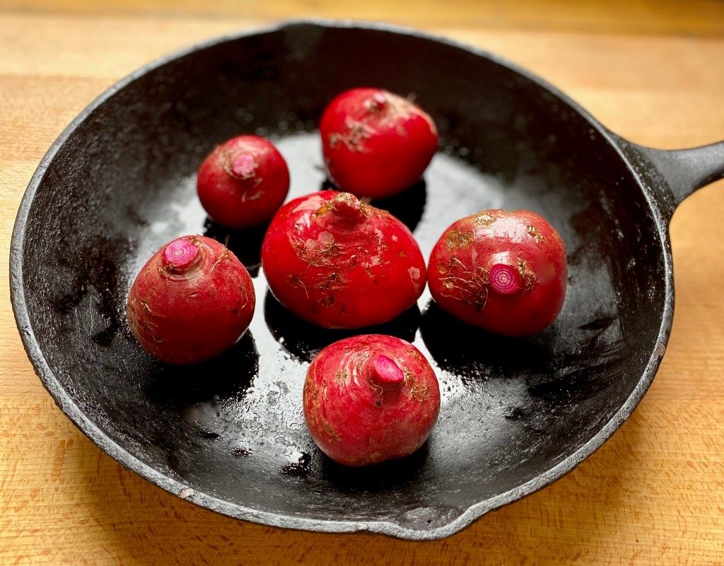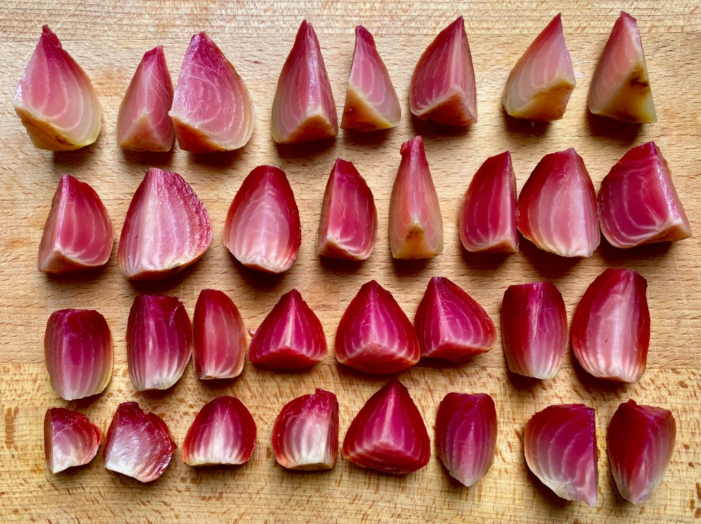 Roast in the oven for 40-45 minutes, or until a knife tip can easily slide inside the beet. Wait for the beets to cool, then remove the skin, and slice into quarters.